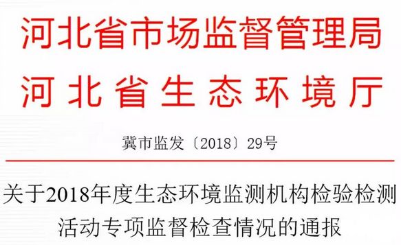 2018年12月20日,河北省市场监督管理局、河北省生态环境厅联合发布了《关于2018年度生态环境监测机构检验检测活动专项监督检查情况的通报》。在抽查的60家环境监测机构中,18家机构存在严重问题,1家机构不具备资质条件,1家机构噪声检测存在不符合标准要求,1家机构暂停,39家机构存在其他一般性问题。60家环境监测机构全部存在问题!