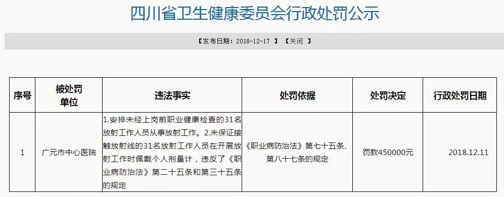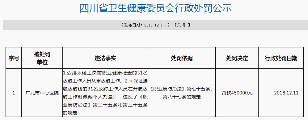 2018年12月17日,四川省卫生健康委员会网站公示,对四川省广元市中心医院,违反了《职业病防治法》第二十五条和第三十五条的规定,安排未经上岗前职业健康检查的31名放射工作人员从事放射工作和未保证接触放射线的31名放射工作人员在开展放射工作时佩戴个人剂量计两项违法事实,根据《职业病防治法》第七十五条、第八十七条的规定,于2018年12月11日作出处以罚款450000元的行政处罚。