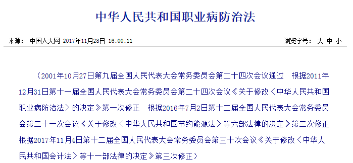 (2001年10月27日第九届全国人民代表大会常务委员会第二十四次会议通过 根据2011年12月31日第十一届全国人民代表大会常务委员会第二十四次会议《关于修改〈中华人民共和国职业病防治法〉的决定》第 一次修正 根据2016年7月2日第十二届全国人民代表大会常务委员会第二十一次会议《关于修改〈中华人民共和国节约能源法〉等六部法律的决定》第二次修正 根据2017年11月4日第十二届全国人民代表大会常务委员会第三十次会议《关于修改〈中华人民共和国会计法〉等十一部法律的决定》第三次修正 根据2018年12月29日第十三届全国人民代表大会常务委员会第七次会议《关于修改〈中华人民共和国劳动法〉等七部法律的决定》第四次修正)