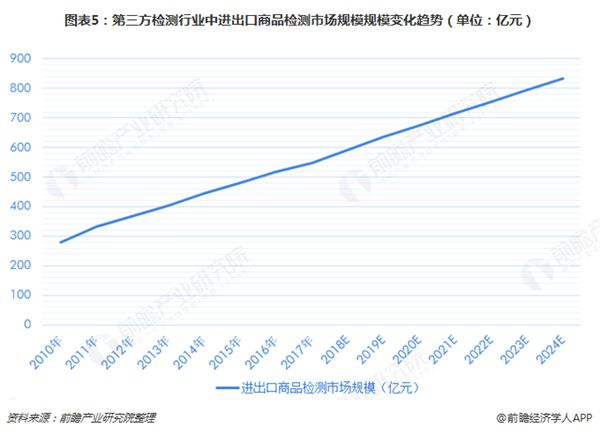 除了上述细分领域外,不得不提的就是占据我国检验检测大比重的进出口检验检测市场。根据前瞻产业研究院发布的《中国第三方检测行业发展趋势与投资决策支持研究报告》预测,该领域2024年的市场规模将突破800亿元。