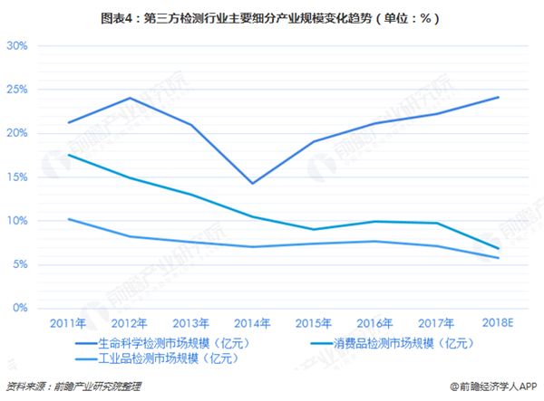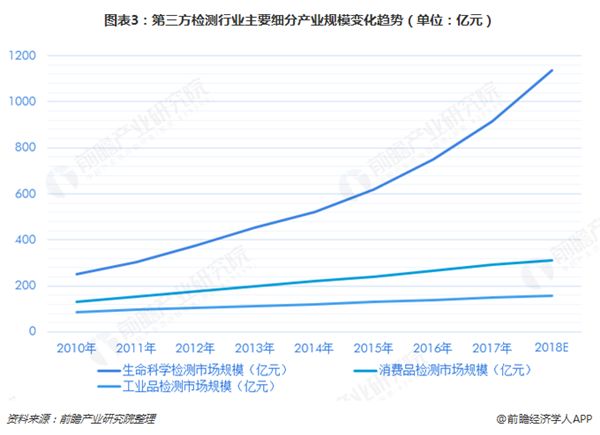 综合考虑各个细分领域检验测检测的发展现状,目前生命科学领域市场空白较大,未来规模体量和增速都将高于其他细分行业。以其中的第三方医学检测为例,随着医疗机构、分子生物科学、神经科学等领域的快速发展,对第三方医学检测的需求得到大幅增长。据测算,2018年生命科学领域的检测规模超过1000亿元。其他细分领域中,消费品检测和工业品检测的市场规模仍保持继续扩张,但增速会有所放缓。预计未来几年仍将保持该发展态势。