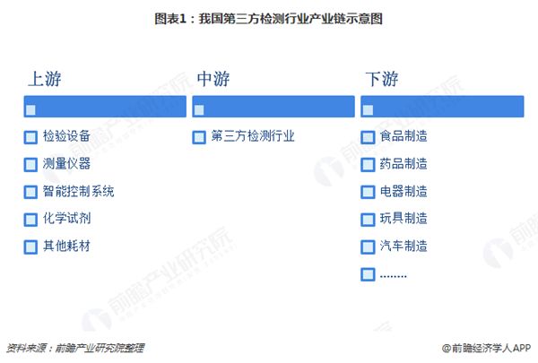第三方检测行业是指第三方检测机构接受客户委托,综合运用科学方法及专业技术对某种产品的质量、安全、性能、环保等方面进行评定,并出具评定报告。第三方检测行业上游主要涉及相应的检验检测硬件设备及智能控制系统等软件服务,同时还包括第三方检测需要用到的化学试剂、耗材等。