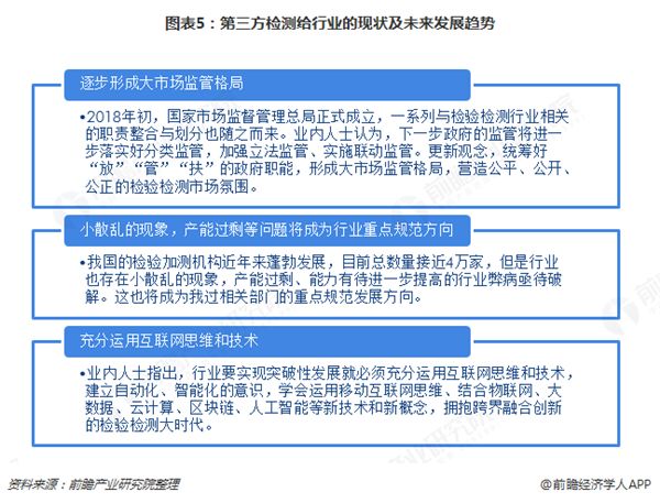 根据行业目前的发展现状以及国家相关部门对于第三方检测行业的检测方向,未来第三方检测行业将改变目前监管不足的现状,逐渐形成大市场监管格局;未来第三方检测行业的小散乱、产能过剩等问题将得到有效地引到和改善;此外,顺应互联网化的大趋势,未来第三方检测机构将更加注重互联网思维和技术的应用,助推行业实现突破性发展。