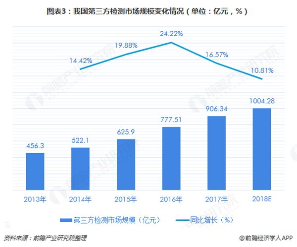 根据前瞻产业研究院发布的《中国第三方检测行业发展趋势与投资决策支持研究报告》数据显示,2017年我过第三方检测市场规模在900亿元左右,近年来维持在10%以上的较高增速。2018全年第三方检测市场规模有望突破千亿元大关,我国第三方检测市场将达到新的高度。
