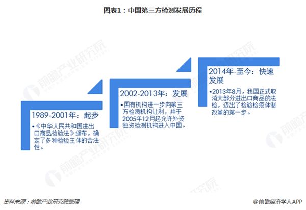 我国检验检测起源于1989年,明显晚于国外发达国家。其中《中华人民共和国进出口商品检验法》的颁布,确定了多种检验主体的合法性。在这一阶段我国检验检测以国有机构为主。2002年之后,国有机构进一步向第三方检测机构让利,外资独资检测机构也随之被允许进入中国市场,中国检验检测市场主体规模有了根本性的改变。2014年以第三方检测机构为代表的我国检验检测行业开始实现快速发展。
