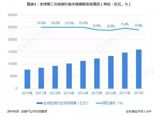 全球检验检测行业发展历史悠久。自人类进入工业时代起,全球检验检测变开始作为一个独立的行业不断发展壮大。目前,美欧日等发达国家均已形成了较为规范的检验检测市场,并培养了一批受到全球认可的大型检验检测机构。在这些大型机构的带领下,全球第三方检测行业市场规模不断扩张。根据前瞻产业研究院发布的《2019-2024年第三方检测行业发展趋势与投资决策支持研究报告》数据显示,2018年全球第三方检测行业的市场规模或突破1.5万亿元,再创历史新高。