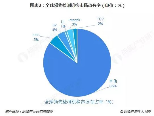据统计,以上领 先的具有国家威望的检测机构中,瑞士通用公证行(SGS)的市场占有率最 高,在5%左右,法国必维国际检验集团(BV)的市场份额紧随其后,在4%左右;英国天祥集团(Intertek)的市场份额则在3%左右。整体来看,全球第三方检测行业的市场较为分散,TOP5企业的市场份额仅15%左右。