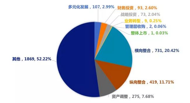 2017年国内共有3579起并购重组事件,从重组并购交易类型上看,公司业务横向扩张仍占主导地位,共有731起并购事件属于横向业务扩张,占总体并购事件的20.42%,另外,有419起并购案例属于公司产业链纵向扩张,占比为11.71%。随着公司业务逐渐走向天花板,2017年国内共有103起并购事件属于业务多元化扩张,占比为2.88%。财务投资、战略投资分别为93起和73起。其他并购交易类型还包括业务转型、管理层收购、整体上市等。
