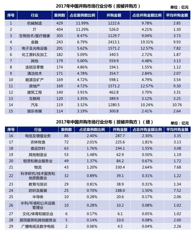 2017年的中国并购市场,如果按照并购数量来统计,排名前三的行业分别是:机械制造、IT、生物技术/医疗健康,这数据正好说明资本与产业的结合方向是符合国家战略发展。并购金额和平均并购金额排名靠前的行业分别是金融、房地产、汽车。房地产其实就是具有金融属于的一个行业,本质上和金融行业没有差别。