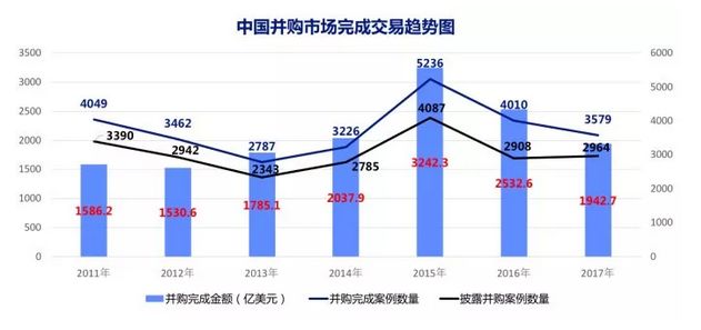 近几年的并购市场可谓是如火如荼呀!根据私募通数据显示,2017年国内共完成并购交易3579起,同比下降10.75%,在2015年交易并购爆发后仍处于回落状态,其中披露并购案例2964起,同比增长1.93%,交易完成资金规模为1942.71亿美元,同比下降23.29%,平均单笔交易金额5428.08万美元。
