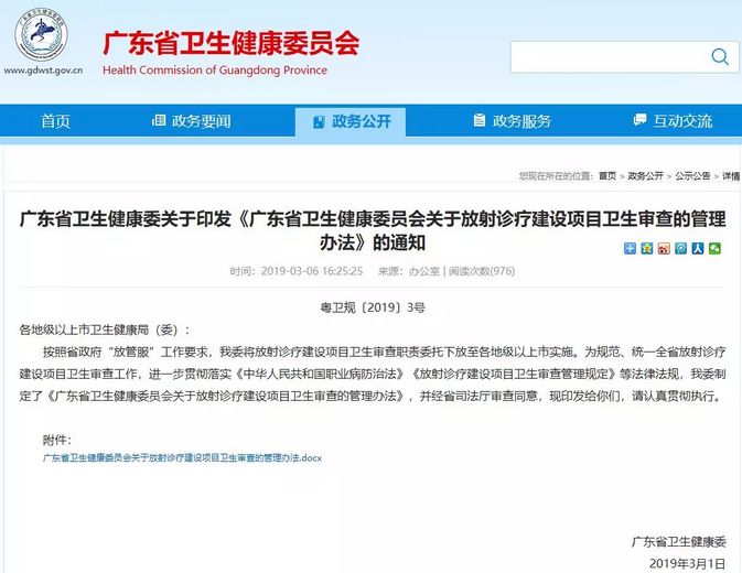 2019年3月1日,广东省卫生健康委发布了《广东省卫生健康委员会关于放射诊疗建设项目卫生审查的管理办法》,该规定自2019年4月15日起实施,有效期5年。