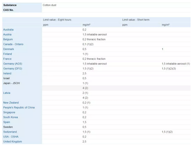 IDLHs文档摘录:OSHA PEL的棉尘标准(1 mg/m3)适用于废棉回收(分拣、混配、清洗、去皱)、绞线等废棉处理作业。