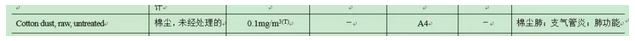 ACGIH的棉尘TLV是:未经处理的棉尘限值为0.1 mg/m3(可吸入颗粒物)。我国的棉尘标准为1 mg/m3(总尘)。限值差距10倍,在不清楚编制依据的情况下,推测我国的“棉尘”是包含了所有性状的棉尘。
