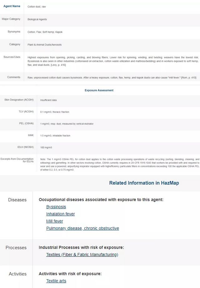 美国国立医学图书馆的Haz-Map数据库提供的有关棉尘方面的信息,(https://hazmap.nlm.nih.gov/category-details?table=copytblagents&id=375),名称定义为“未加工的棉尘”,存在危害的工艺过程为“纺织品的纤维和织物制造”,这些都表明服装成品加工过程中产生的粉尘不能识别为“棉尘”。