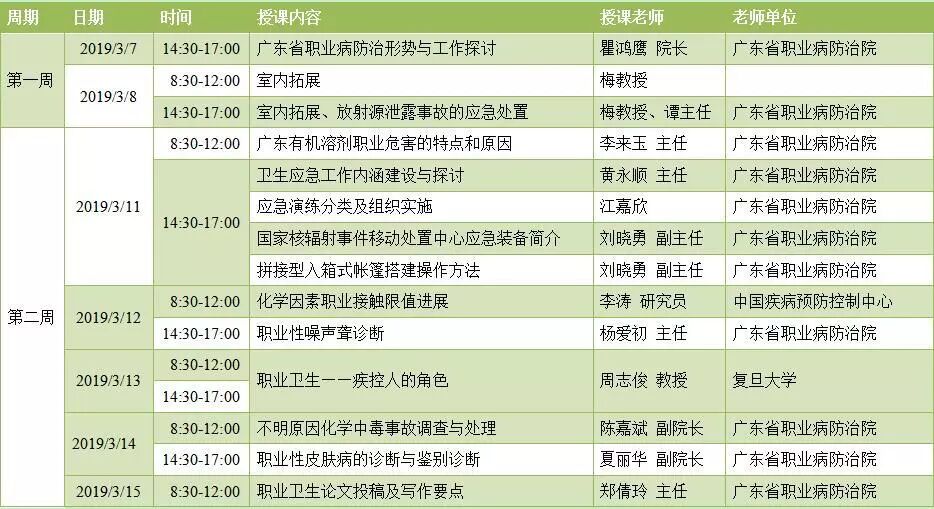 项目邀请中国疾控中心、中国军事科学院、广东省职业病防治院、广东省疾控中心、中山大学、复旦大学、暨南大学、南方医科大学、华南师范大学等机构、高校专家学者进行授课。