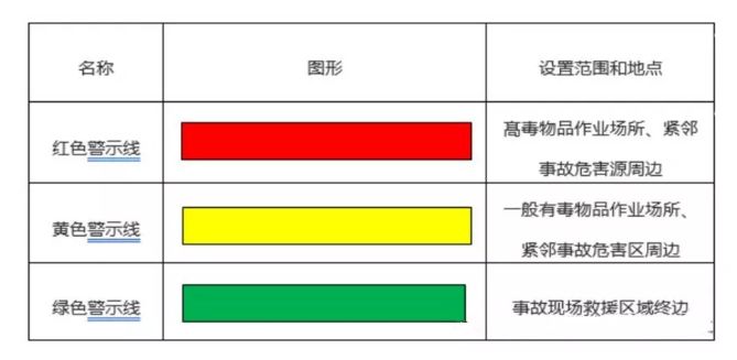 警示线是界定和分隔危险区域的标识线,分为红包、黄色和绿色三种。按照需要,警示线可喷涂在地面或制成色带设置。如下图:
