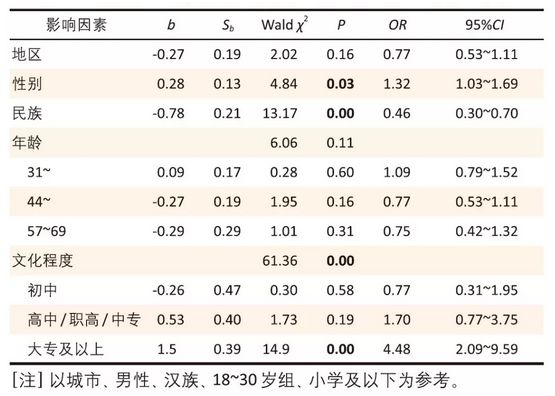 logistic回归分析结果显示,性别、民族、文化程度是职业人群健康素养水平的独立影响因素。见表2。