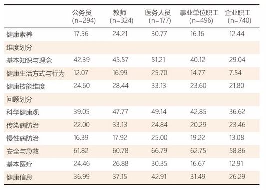 以甘肃省公务员、教师、医务人员、事业单位职工及企业职工这五类职业人群为研究对象,分析这五类职业人群健康素养水平及其影响因素,为今后开展健康教育工作提供科学依据。
