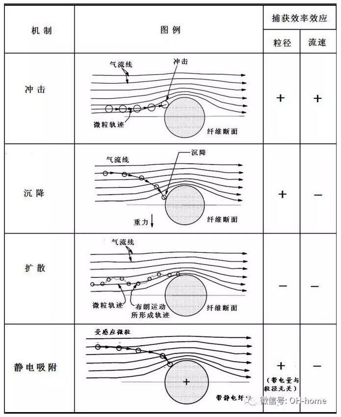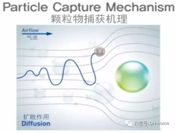 颗粒状物一般为纤维状物质(如无纺布、带静电滤布等)来将颗粒状物捕集(过滤),利用如图2所描述不同的机制,如冲击(Impaction)、扩散(Diffusion)、拦截(Interception) 、沉降( Sedimentation ) 、静电吸附( ElectrostaticAttraction)等,使得颗粒状物附着于滤材上被 捕集,使得粒状物不随干净空气进入呼吸系统。气状物则使用物质(滤毒盒)将气态分子吸附(如有机溶剂吸附在多孔性的活性碳上)、吸收(如酸性气体被含有氢氧化钠或氢氧化钾的吸收物质吸收)、或触媒反应(如混合锰氧或铜氧化合物的物质,将一氧化碳与氧反应成二氧化碳),将危害的气态分子滤除,让干净空气进入呼吸系统。