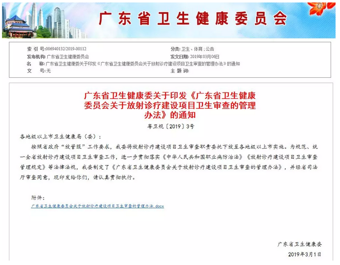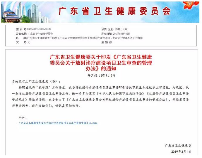 广东省卫生健康委关于印发《广东省卫生健康委员会关于放射诊疗建设项目卫生审查的管理办法》的通知