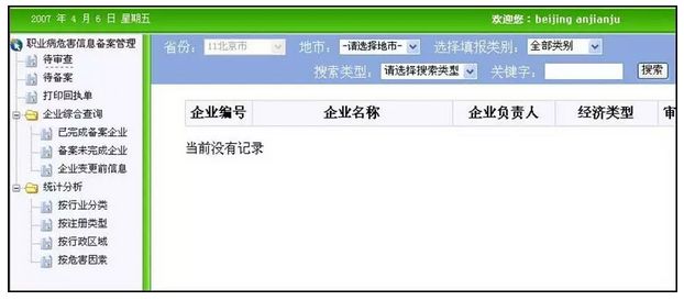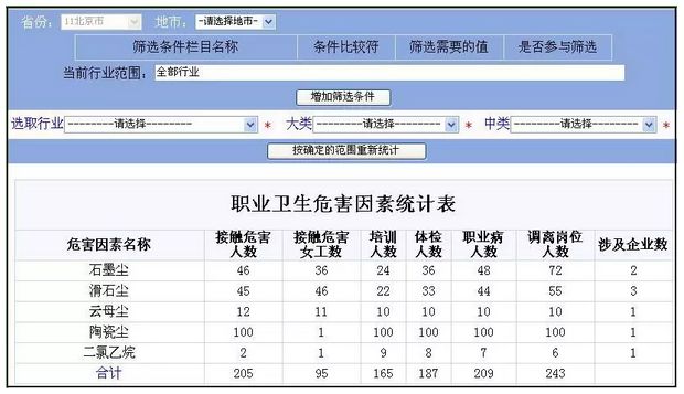 点击[统计分析]:对已备案的企业,实施不同类型的统计分析。以“按危害因素”统计分析为例,调出统计分析页面。