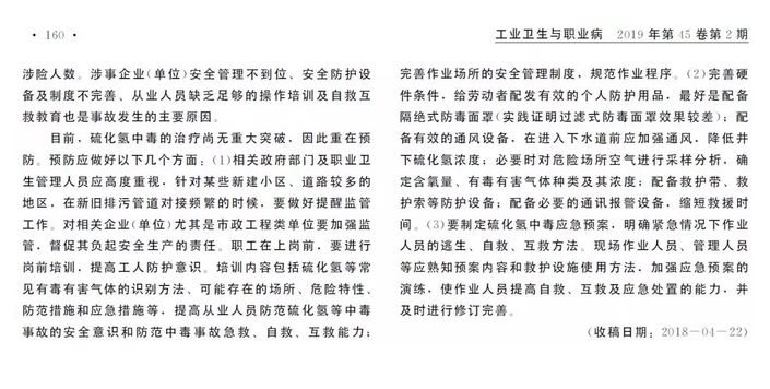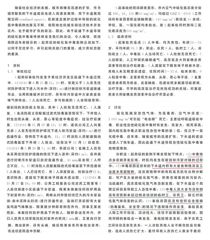 硫化氢属窒息性气体,为高毒类,空气中浓度>1000mg/m3可引起“电击样”死亡,主要经呼吸道吸收中毒。职业性急性硫化氢中毒时有发生,危害大,病死率高,国内硫化氢中毒占职业性急性中毒的第2位,仅次于一氧化碳中毒。近年来,随着城市的迅速扩张,下水道的建设也进入了快车道,因此疏通下水道导致急性硫化氢中毒事故明显增加。