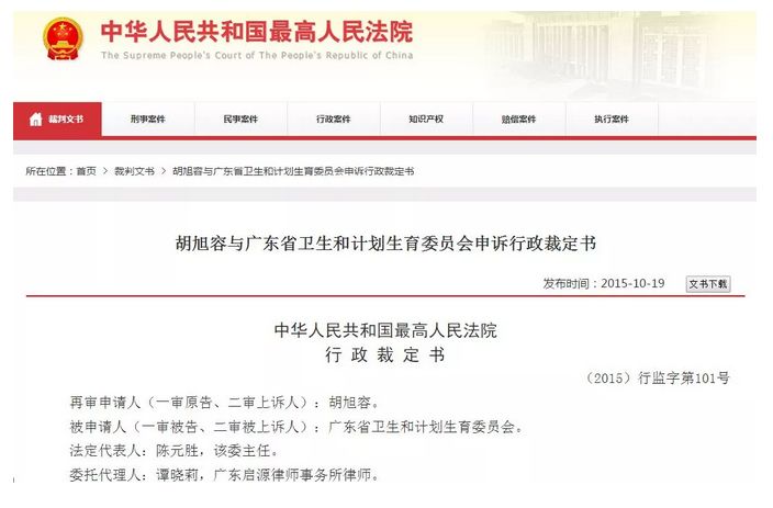 以上内容参见最 高人民法院关于胡旭容与广东省卫生和计划生育委员会申诉行政裁定书[(2015)行监字第101号]。