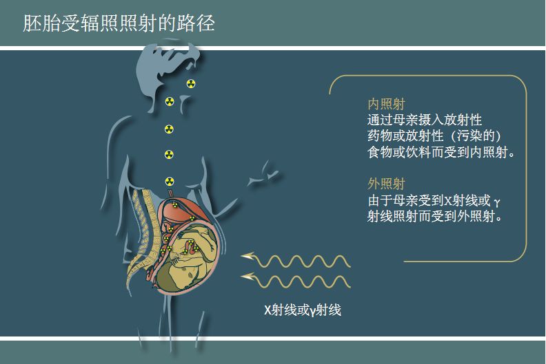母亲通过饮食所载带的放射性物质(内照射),或通过直接外照射,可能使胚胎或胎儿受到照射。由于胎儿受子宫的保护,所以对于多数辐射照射事件来说,胎儿所受的剂量往往低于母亲受到的剂量。然而,胚胎和胎儿对辐射特别敏感,照射的健康后果可能是严重的,即使辐射剂量低于母亲直接受到的剂量。这类后果包括生长迟缓、畸形、脑功能受损和癌症等后果。