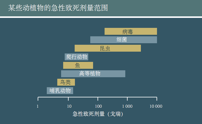 致死剂量是指使受照对象死亡50%的剂量。对于在比较短时间段内受到照射(急性)的植物而言,致死剂量可以是小于10戈瑞到大约1000戈瑞。总的说来,大的植物的辐射敏感性比小的植物更强。小哺乳动物的致死剂量范围是6~10戈瑞,大哺乳动物的约为2.5戈瑞。有些昆虫、细菌和病毒可以耐受1000戈瑞以上的剂量。