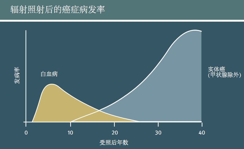 在辐射照射后的几年里,首先出现的是白血病、甲状腺癌和骨癌,而其他癌症有时需要到照射后至少10年,甚至往往是几十年后才会显现出来。但是,没有一种单一类型的癌症是只由于辐射照射引起的,所以不可能将辐射诱发的肿瘤与其他原因诱发肿瘤区别开来。因此,必须估算特定剂量后癌症的发病率,以便为制定照射限制提供坚实的科学基础。