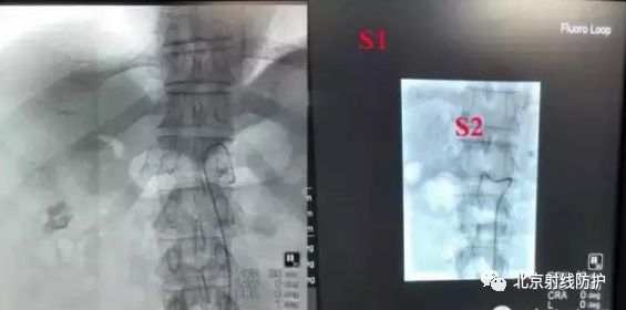 左边的是不关光圈,右边是关光圈。S1代表被遮挡的面积,S2为透视中所见的面积,经计算,S1:S2=4:1 就是说,在选择腹腔干的过程中,如果像这样关光圈,只显示腹腔干周围的区域,光圈相当于原来的20%!!光圈缩小50%射线可以衰减32%,那光圈缩小到原来的20%,那肯定更低!也许有人说,我操作非常快,几秒钟就选好了,可是,你能保证不会遇到有难度的么?再说,这不是一次两次手术,是几年,几十年的工作量,你能少被照射多少射线呢?