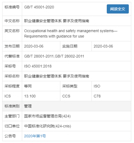 GB/T 45001-2020《职业健康安全管理体系 要求及使用指南》正式发布,已于2020年3月6日实施。
