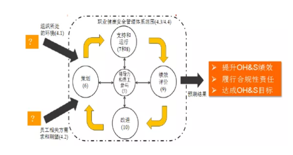 要求组织的职业健康安全管理体系应融入组织的战略性过程的策划中,标准中新增加的条款“组织所处的环境”,要求对组织和环境两者之间的利益和机遇要协同考虑,一旦被确定为优先项,减少负面风险和开拓有益机遇的措施则应被融入职业健康安全管理体系运行的策划中。