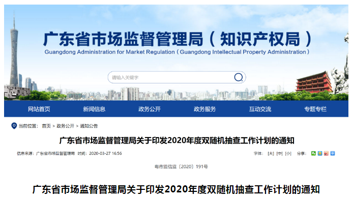 广东省市场监督管理局关于印发2020年度双随机抽查工作计划的通知