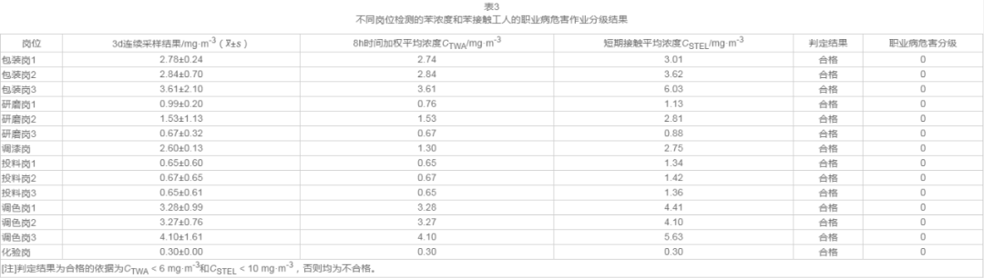 2.3 不同岗位环境中的苯浓度以及我国职业病危害作业分级结果