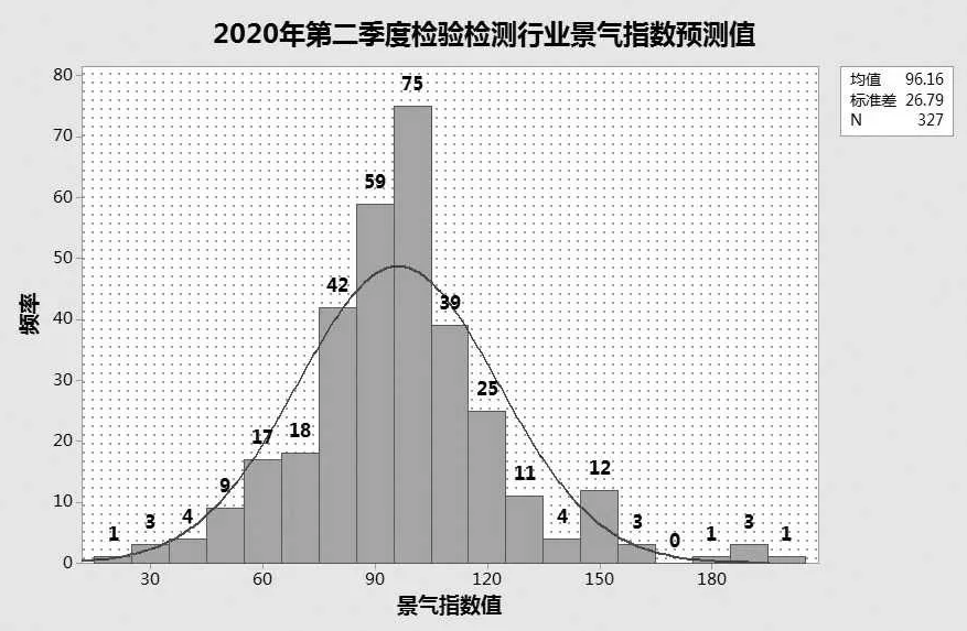2020年第一季度,检验检测行业景气指数值为83.96,为自2018年第四季度景气指数开始统计以来的最低点。从本期统计直方图来看,本期统计结果与以往略显不同:本期的最大频数出现在景气指数值90左右,2019年第四季度以及更早时候在景气指数值均在100时达到最大频数。这也证明了疫情所造成的客户复产延迟、交通出行限制等因素对整个行业带来一定的负面影响。此外,在景气指数值为50左右时也有一个频数较高的区域,这些频数主要由日用消费品、石油煤炭以及电子电器等领域的检测机构带来。这也说明了在疫情影响下,因城市疫情防控,部分与疫情相关物资和服务联系不甚紧密的行业的检测机构的生存尤为困难。