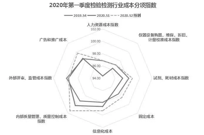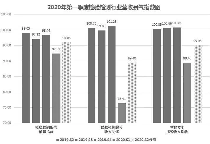 从测算结果看,2020年第二季度,检验检测行业景气指数预测值有所回升,达到96.16,较一季度增加12.2个百分点,但比2019年第一季度末行业的预期106.39的景气值减少10.2个百分点。可以预期,随着各行业逐步复工复产,为产业服务的检验检测行业在二季度景气状况有望迎来较大提升,但较去年同期仍有较大降幅。