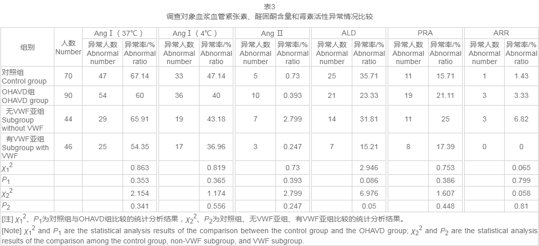 采集研究对象晨起空腹静卧状态下静脉血5 mL(血液样品采集前2 h禁烟,OHAVD组人群于入院第2日采集)。利用全自动化学发光仪[型号:AXCEED 400T,博奥赛斯(天津)生物科技有限公司,中国]、血浆血管紧张素、醛固酮测定试剂盒(DiaSorin公司,意大利)检测AngⅠ(37℃)、AngⅠ(4℃)、ALD的含量。其中AngⅠ(37℃)、AngⅠ(4℃)的检测是将样本一分为二,一份在37℃温育1h,另一份在4℃冰浴1 h,然后再分别进行AngⅠ含量检测。采用磁微粒化学发光仪(型号:A2000,郑州安图生物工程股份有限公司,中国)、AngⅡ检测试剂盒(郑州安图生物工程股份有限公司,中国)检测Ang Ⅱ含量。计算PRA、ARR,PRA=[AngⅠ(37 ℃)-AngⅠ(4 ℃)] ×0.74,ARR=ALD/(PRA×10)。