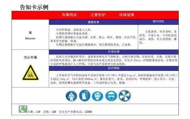⑵告知卡应当标明职业病危害因素名称、理化特性、健康危害、接触限值、防护措施、警告标识、指令标识、应急处理及急救电话等。