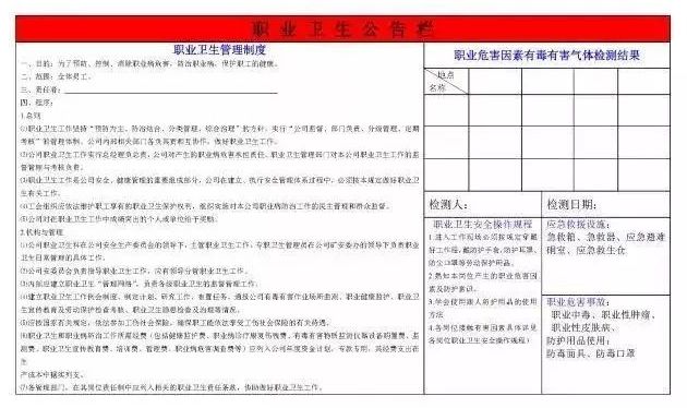 职业病防治法第二十四条规定:产生职业病危害的用人单位,应当在醒目位置设置公告栏,公布有关职业病防治的规章制度、操作规程、职业病危害事故应急救援措施和工作场所职业病危害因素检测结果。