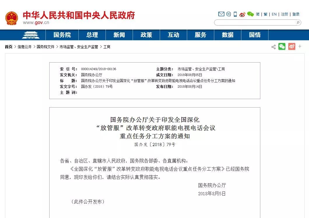 全国深化“放管服”改革转变政府职能电视电话会议重点任务分工方案