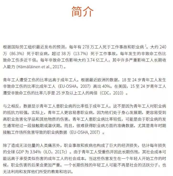 安全危害,在没有风险控制措施的情况下可能立即造成伤害(比如烧伤、扭伤、割伤、挫伤、骨折、内伤、脑损伤、窒息等)。安全危害包括高空作业、使用危险机械、设备或工具;驾驶、接近交通工具的工作;建沟渠;行走在光滑的平面上或不规整的地面上;操作或接近可燃或爆炸性材料或物质。青年工人尤其容易面临安全危害,因为他们工作经验有限,技能培训不多、缺乏安全危害和规定方面的信息或指导,以及缺少监督(IPECet al.,2002)。