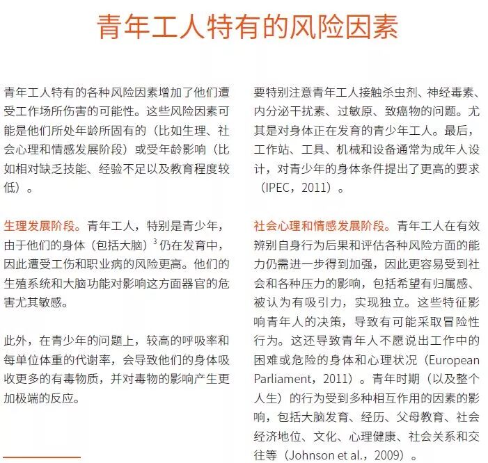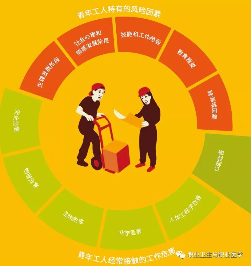 每个工作场所都可能存在着几种不同的危害,对工人的安全和健康造成各种各样的后果。以下是对青年工人的生理和社会心理具有特别威胁的危害类型,这是因为青年工人有独特的风险因素,所以更多地接触这些风险。