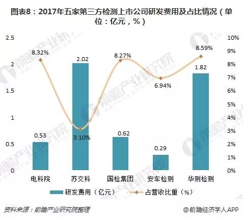 具体来看,五家第三方检测上市公司中,研发投入最高的是苏交科,2017年研发费用总额达到2.02亿元,但占营收的比重只有3.10%;其余四家公司研发投入均不足2亿元,且研发费用在营收的比重也不到9%。