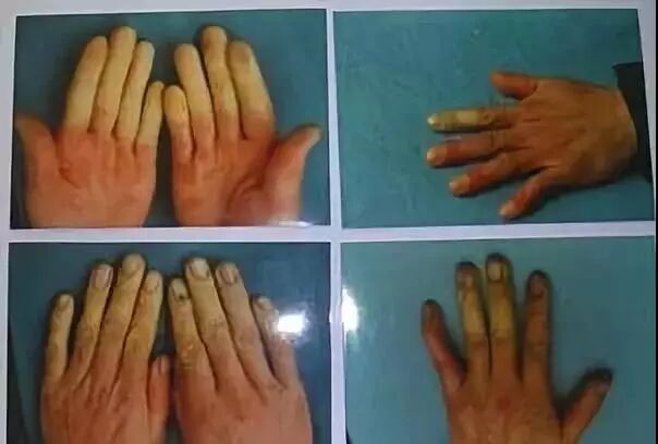 主要是由于人体长期受低频率、大振幅的振动,使植物神经功能紊乱,引起皮肤振动感受器及外周血管循环机能改变,久而久之,可出现一系列病理改变。早期可出现肢端感觉异常、振动感觉减退。主诉手部症状为手麻、手疼、手胀、手凉、手掌多汗、手疼多在夜间发生;其次为手僵、手颤、手无力(多在工作后发生),手指遇冷即出现缺血发白,严重时血管痉挛明显。X片可见骨及关节改变。
