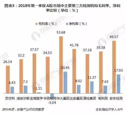 从盈利情况来看,医疗领域第三方加测机构华大基因净利润最高,达1.01亿元;迪安诊断次之,为0.63亿元。同时,华大基因的毛利率、净利率相对也处于最高位,分别为53.68%和20.45%,可能由于华大基因业务的稀缺性所致;安车检测在毛利率与净利率方面表现亦为突出。