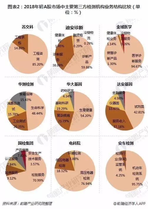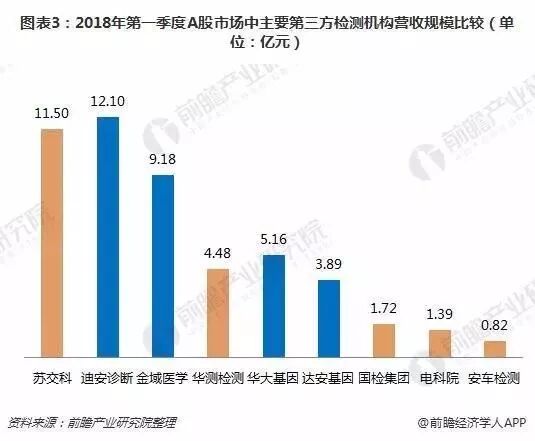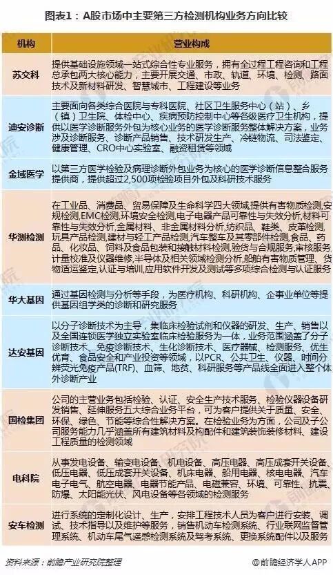 当前第三方检测行业中,苏交科、迪安诊断、金域医学、华测检测、华大基因、达安基因、国检集团、电科院、安车检测等企业发展势头较好;在这些A股市场的企业中,迪安诊断、金域医学、华大基因与达安基因在医疗领域的三番过检测较为领先,而苏交科、华测检测等则是在不同领域中进行错位竞争。