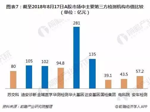 截至2018年8月17日,这7家上市公司的市值如下图所示。虽然迪安诊断净资产收益率最高,但市场更看好华大基因,其市值高达281亿元;达安基因、迪安诊断、金域医学依次位于其后。值得注意的是,医疗领域第三方检测的市值相对其他领域的第三方检测机构市值更高,规模相对更大。
