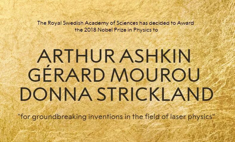 当地时间10月2日上午11时45分(北京时间10月2日下午5时45分)2018年度诺贝尔物理学奖获得者揭晓,瑞典皇家科学院决定将2018年诺贝尔物理学奖授予美国贝尔实验室科学家Arthur Ashkin、巴黎综合理工大学和密歇根大学(双聘)的Gérard Mourou以及加拿大滑铁卢大学科学家Donna Strickland以表彰他们“激光物理领域的突破性发明”。