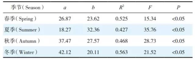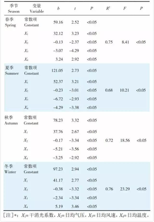 拟合得到四季的Edry与PM2.5浓度四季均呈正相关 ;日均气压、日均风速与PM2.5浓度四季均呈负相关;日均温度与PM2.5浓度在冬春季呈正相关,夏秋季度呈负相关。